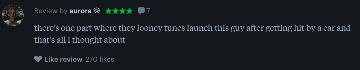 A simple way to improve it: there’s a moment (and excuse the minimal spoiler) where a character is run down by a car and they use the fakest, crappiest dummy in existence to show you the results of the accident. Like, you see the doll fly away and bounce on the floor a couple of times… give me more of that kind of thing! More movies should go that route instead of trying to look super serious with visual effects.